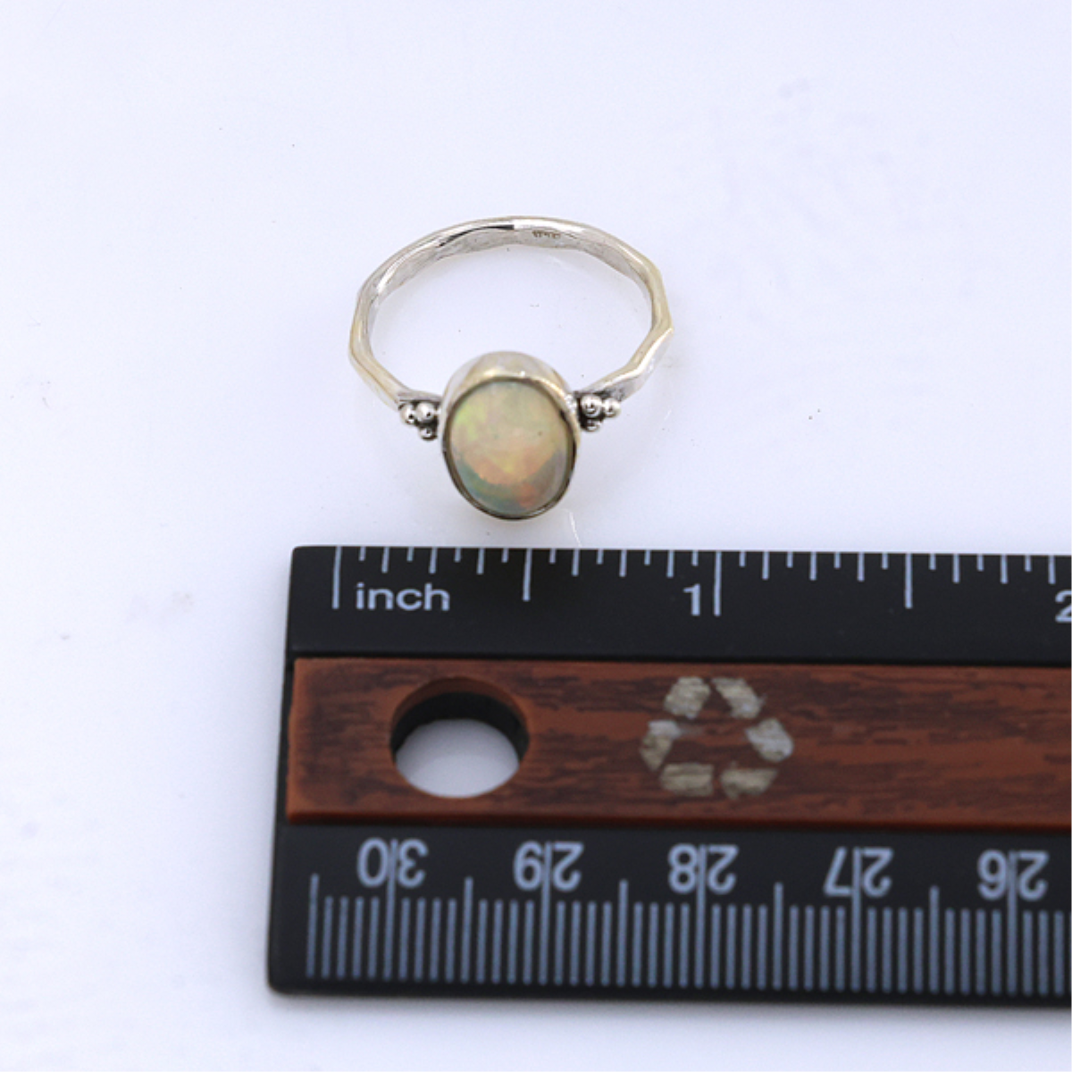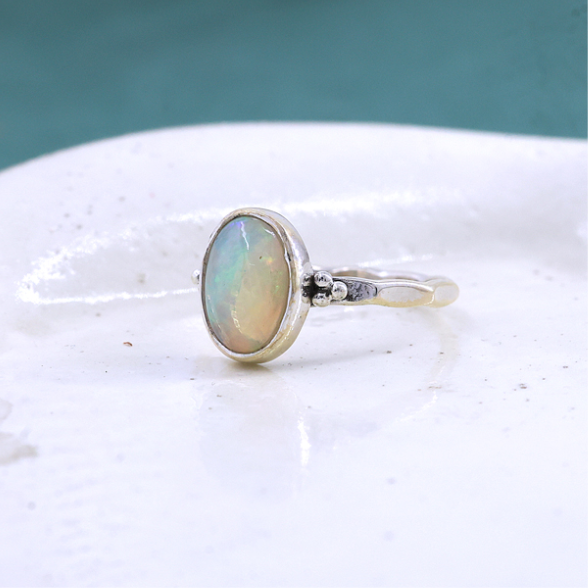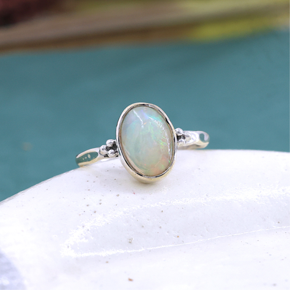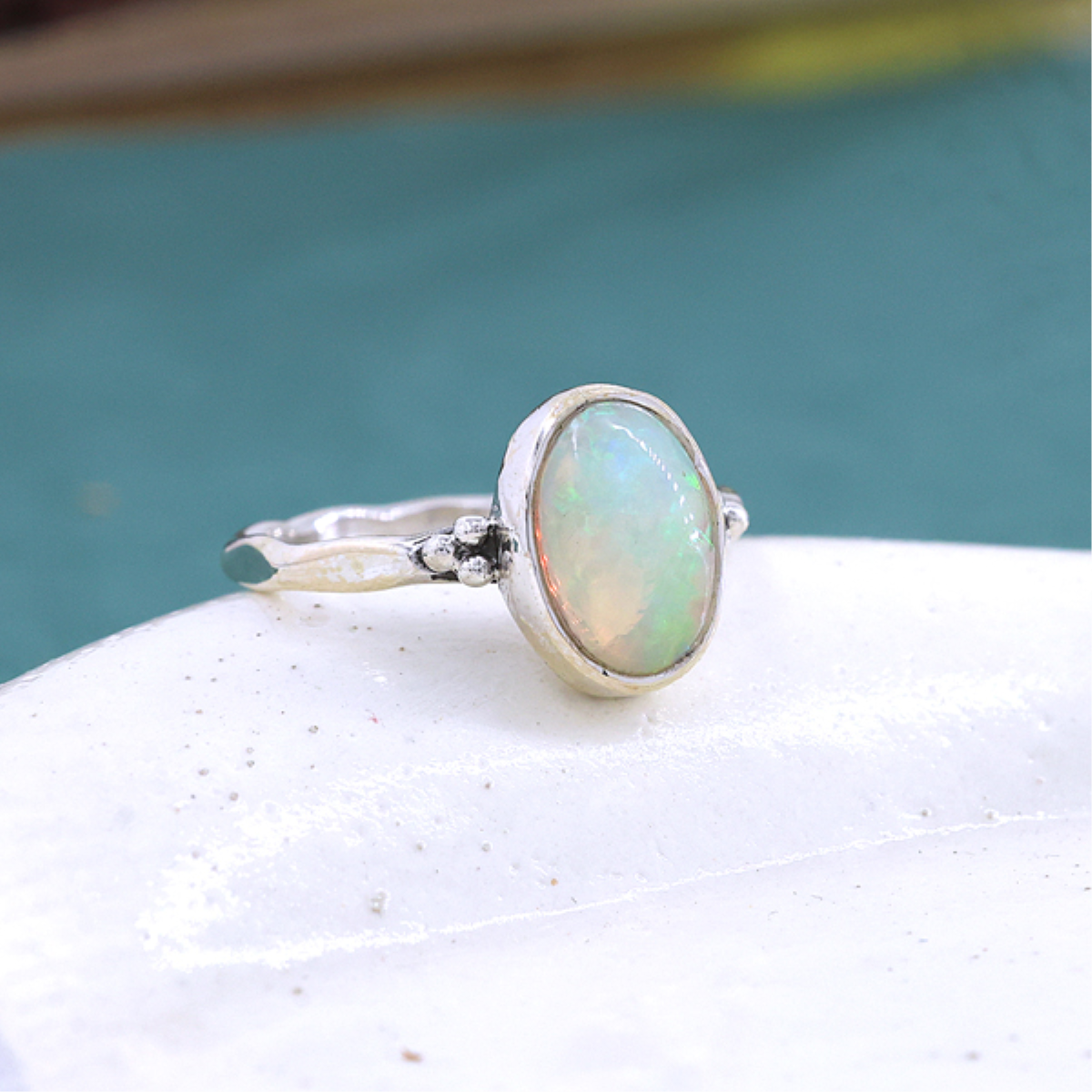 This elegant ring features a captivating oval-shaped Ethiopian opal set in a smooth sterling silver bezel. The opal's mesmerizing play of colors adds a touch of magic, making it a truly unique statement piece. Designed with delicate detailing, it offers both charm and comfort, perfect for daily wear or special occasions. A timeless choice for opal enthusiasts and lovers of distinctive jewelry.