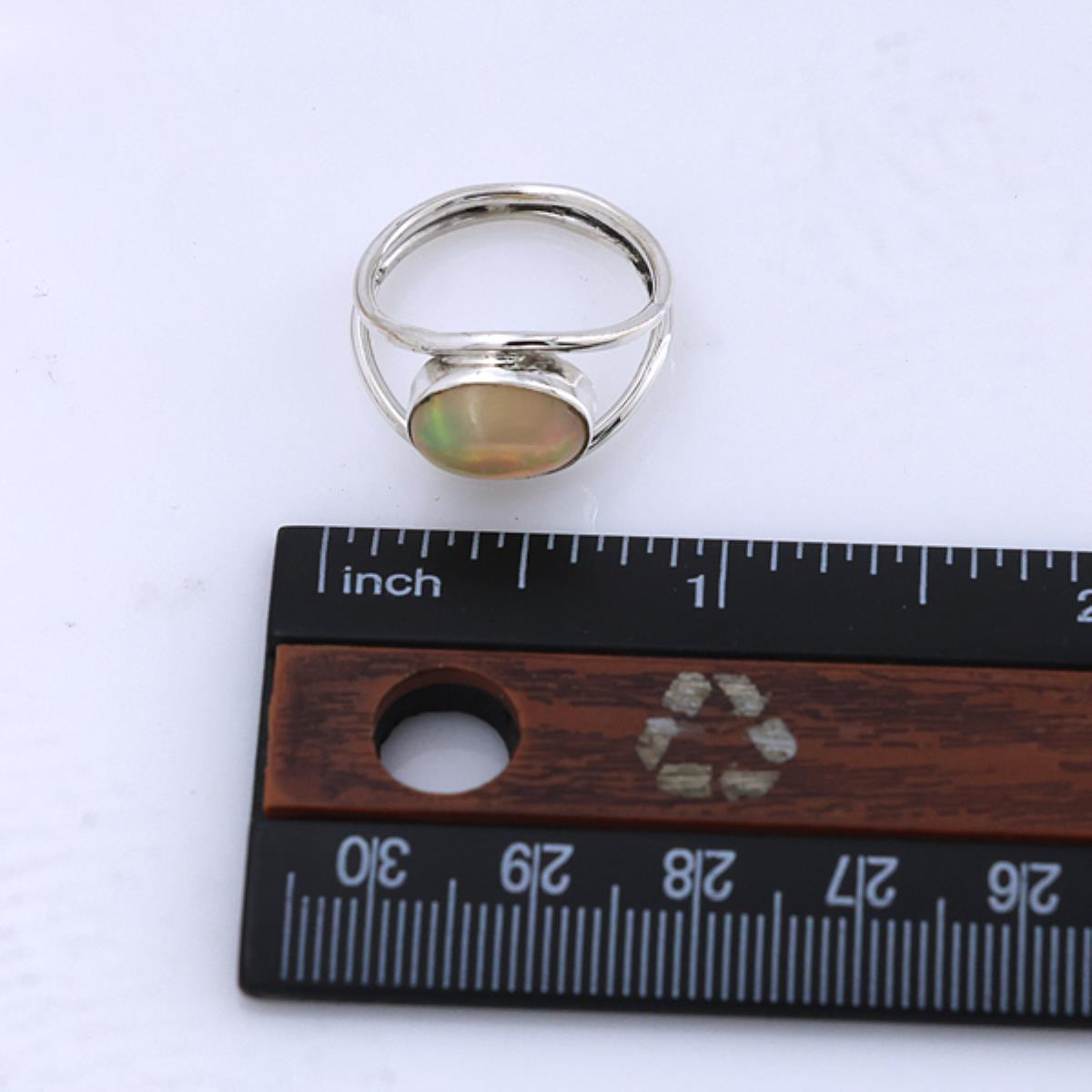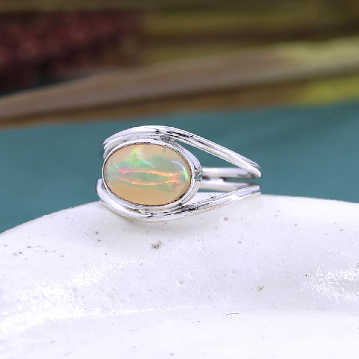 This elegant ring features a stunning oval opal gemstone set in a sleek, open sterling silver band. The opal displays a captivating play of colors, ranging from green to soft amber hues, shimmering with every angle. Its modern yet timeless design is versatile, making it suitable for any occasion. The smooth finish and minimalistic style add to its charm, perfect for a subtle yet sophisticated touch of elegance.